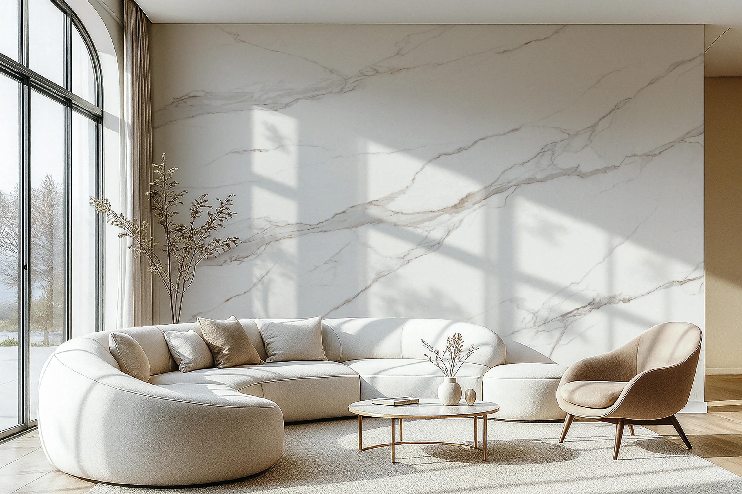 Pure snow-white canvas brushed with graceful taupe and GOLDEN VEINs, flowing like mountain ridges under sunlight—elegant, timeless, and effortlessly refined.